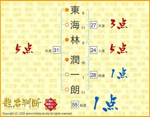 東(8画)海(11画)林(8画) 潤(16画)一(1画)朗(11画)
