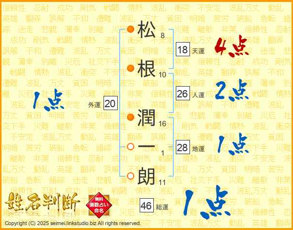松(8画)根(10画) 潤(16画)一(1画)朗(11画)