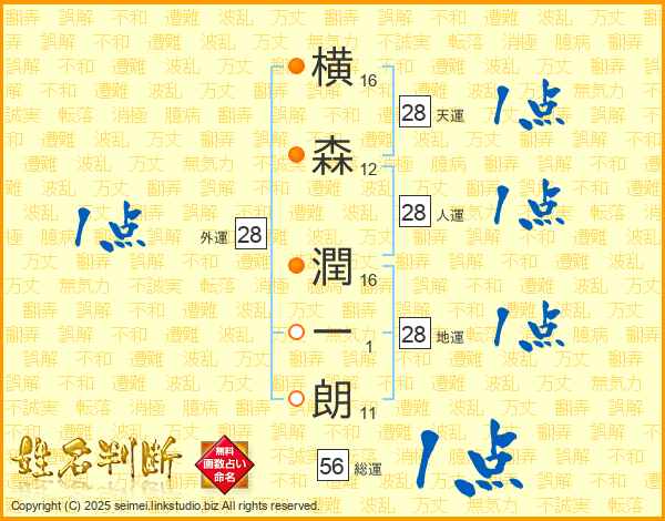横(16画)森(12画) 潤(16画)一(1画)朗(11画)