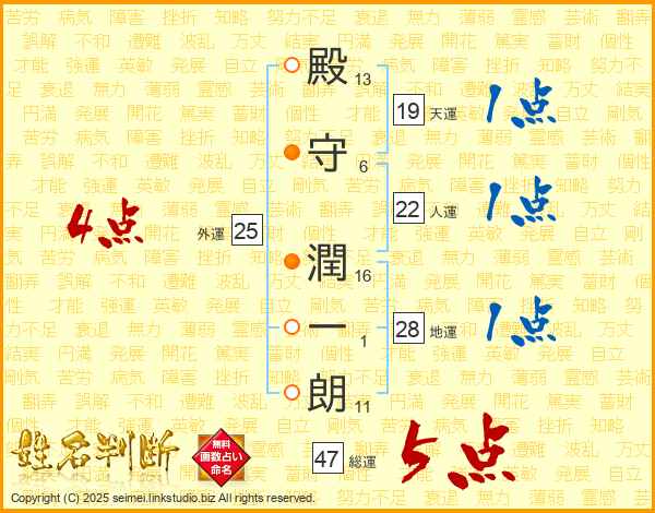 殿守潤一朗さんの総運は47画の5点!