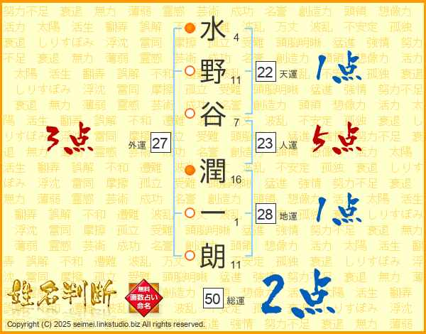 水(4画)野(11画)谷(7画) 潤(16画)一(1画)朗(11画)