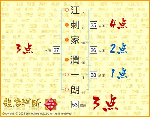 江(7画)刺(8画)家(10画) 潤(16画)一(1画)朗(11画)