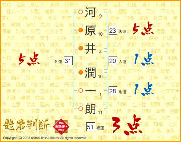 河(9画)原(10画)井(4画) 潤(16画)一(1画)朗(11画)