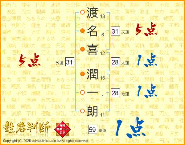 渡(13画)名(6画)喜(12画) 潤(16画)一(1画)朗(11画)