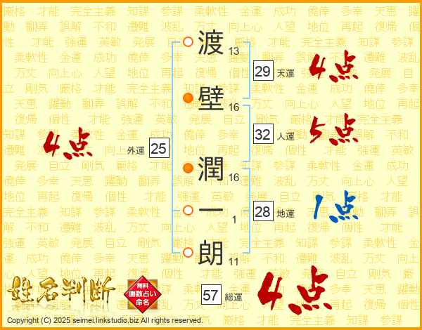 渡(13画)壁(16画) 潤(16画)一(1画)朗(11画)