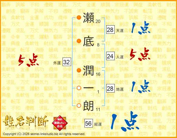 瀬(20画)底(8画) 潤(16画)一(1画)朗(11画)