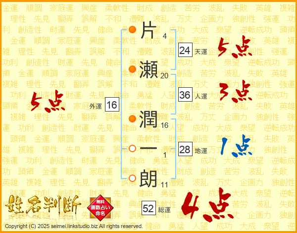 片(4画)瀬(20画) 潤(16画)一(1画)朗(11画)