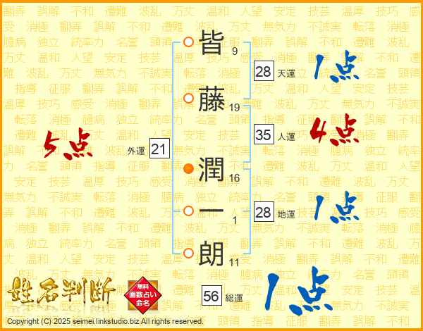 皆(9画)藤(19画) 潤(16画)一(1画)朗(11画)