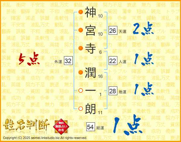 神(10画)宮(10画)寺(6画) 潤(16画)一(1画)朗(11画)