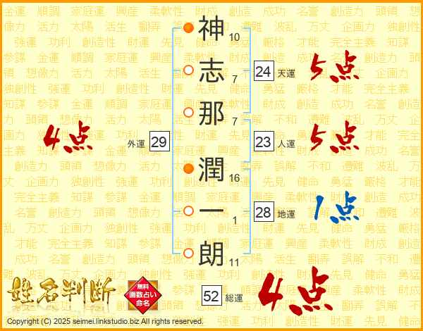 神(10画)志(7画)那(7画) 潤(16画)一(1画)朗(11画)