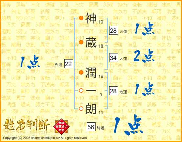 神(10画)蔵(18画) 潤(16画)一(1画)朗(11画)