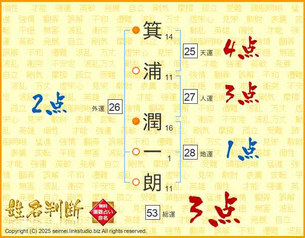 箕(14画)浦(11画) 潤(16画)一(1画)朗(11画)