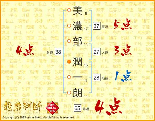 美(9画)濃(17画)部(11画) 潤(16画)一(1画)朗(11画)