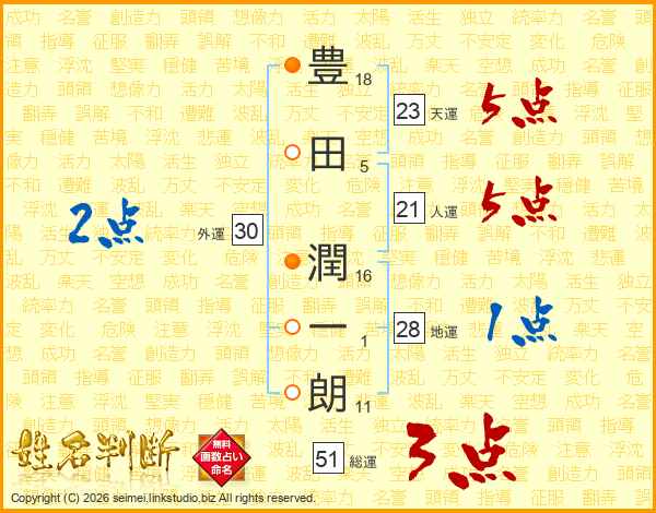 豊(18画)田(5画) 潤(16画)一(1画)朗(11画)