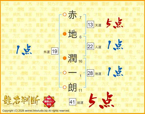 赤(7画)地(6画) 潤(16画)一(1画)朗(11画)