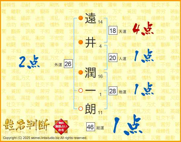 遠(14画)井(4画) 潤(16画)一(1画)朗(11画)