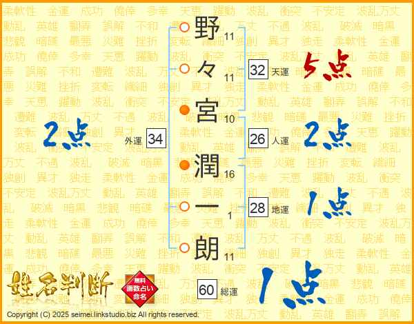野(11画)々(11画)宮(10画) 潤(16画)一(1画)朗(11画)