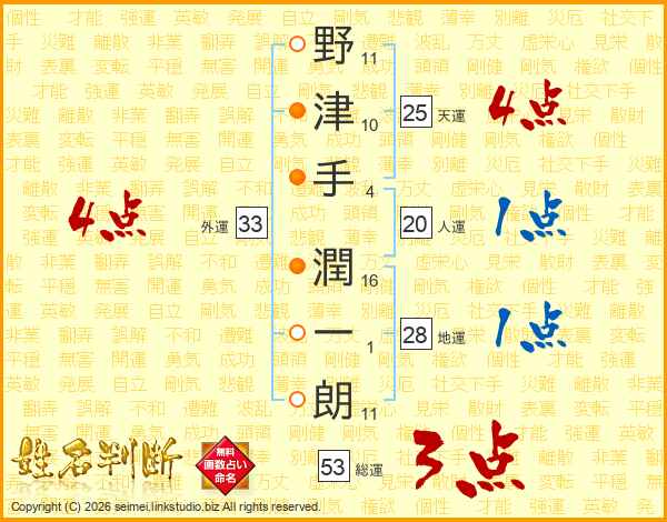 野(11画)津(10画)手(4画) 潤(16画)一(1画)朗(11画)