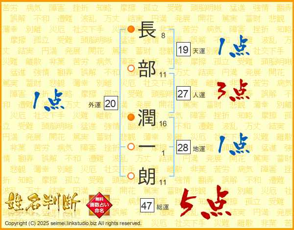 長(8画)部(11画) 潤(16画)一(1画)朗(11画)