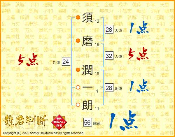 須(12画)磨(16画) 潤(16画)一(1画)朗(11画)