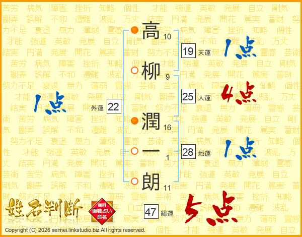 高(10画)柳(9画) 潤(16画)一(1画)朗(11画)
