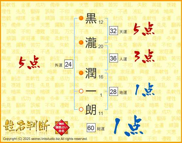 黒(12画)瀧(20画) 潤(16画)一(1画)朗(11画)