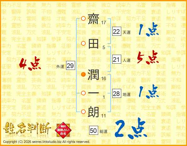 齋(17画)田(5画) 潤(16画)一(1画)朗(11画)