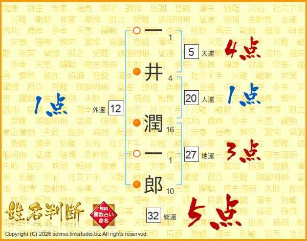 一(1画)井(4画) 潤(16画)一(1画)郎(10画)