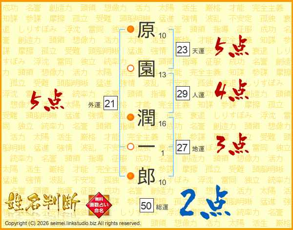 原(10画)園(13画) 潤(16画)一(1画)郎(10画)