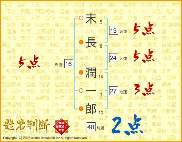 末(5画)長(8画) 潤(16画)一(1画)郎(10画)