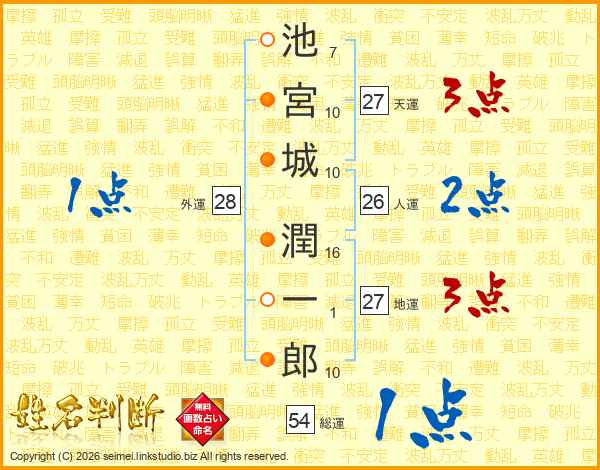池(7画)宮(10画)城(10画) 潤(16画)一(1画)郎(10画)