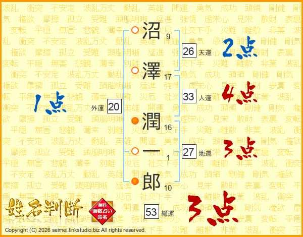 沼(9画)澤(17画) 潤(16画)一(1画)郎(10画)