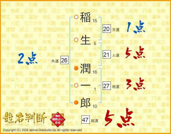 稲(15画)生(5画) 潤(16画)一(1画)郎(10画)