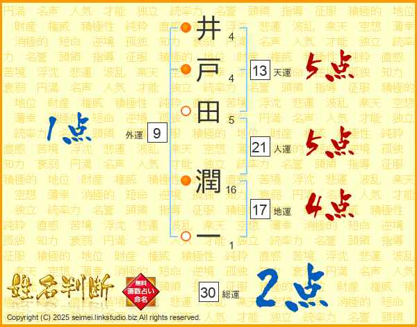 井(4画)戸(4画)田(5画) 潤(16画)一(1画)