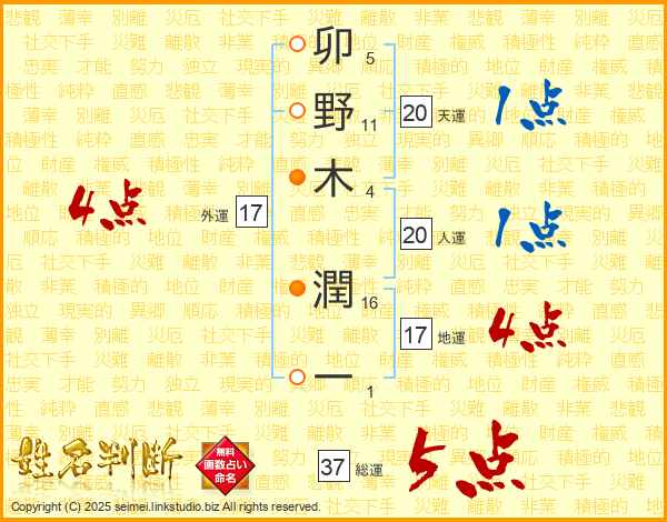 卯野木潤一さんの総運は37画の5点!