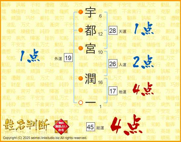 宇(6画)都(12画)宮(10画) 潤(16画)一(1画)