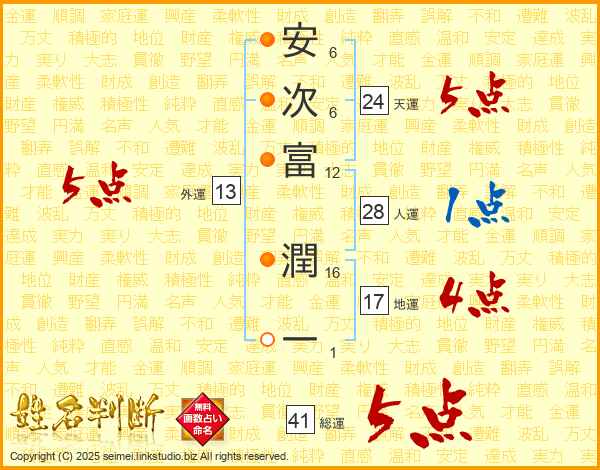 安(6画)次(6画)富(12画) 潤(16画)一(1画)