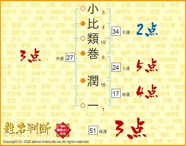 小(3画)比(4画)類(19画)巻(8画) 潤(16画)一(1画)