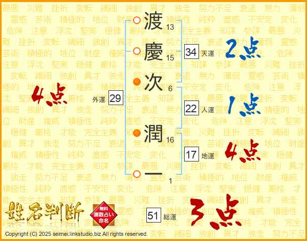 渡(13画)慶(15画)次(6画) 潤(16画)一(1画)
