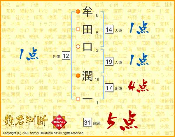 牟(6画)田(5画)口(3画) 潤(16画)一(1画)