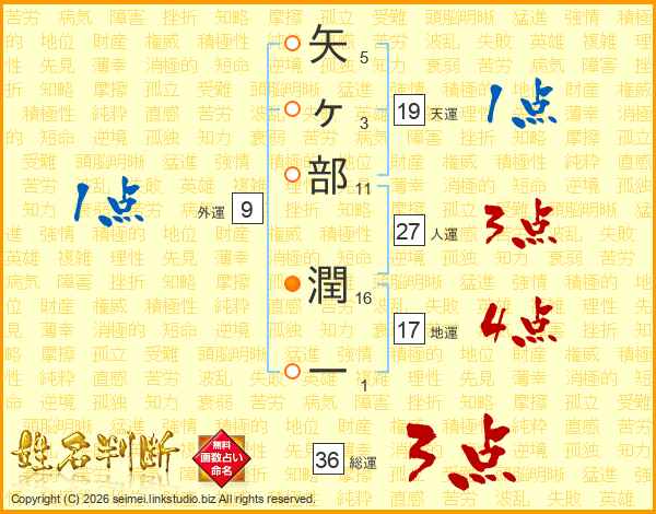 矢ヶ部潤一さんの総運は36画の3点!