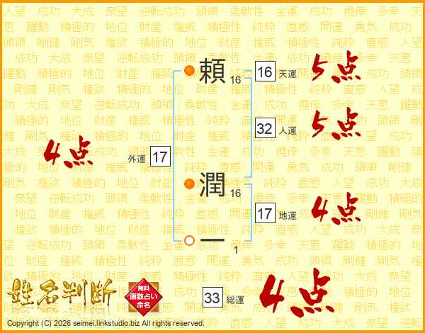 生活面を象徴する運勢です。外部から受ける影響力を表し、結婚運、家庭運や職場、環境への順応性を表します。総運から人運を引いた画数。姓や名が1文字の場合を除く。