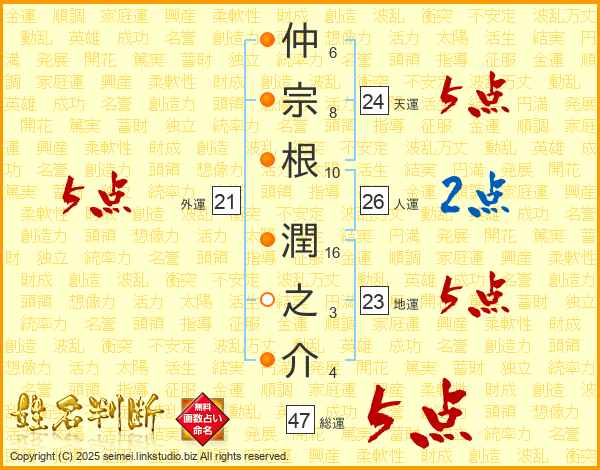 仲(6画)宗(8画)根(10画) 潤(16画)之(3画)介(4画)