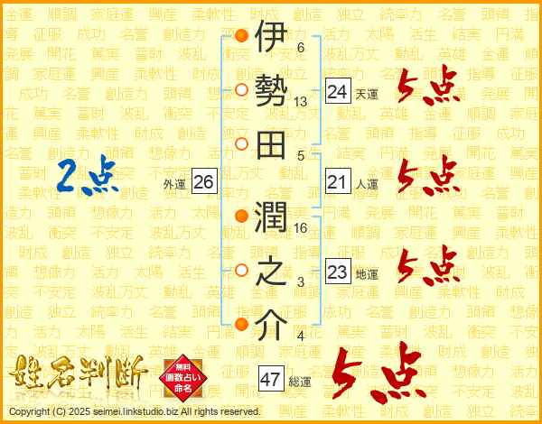 伊(6画)勢(13画)田(5画) 潤(16画)之(3画)介(4画)