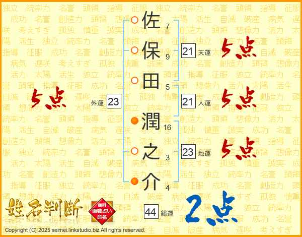 佐(7画)保(9画)田(5画) 潤(16画)之(3画)介(4画)