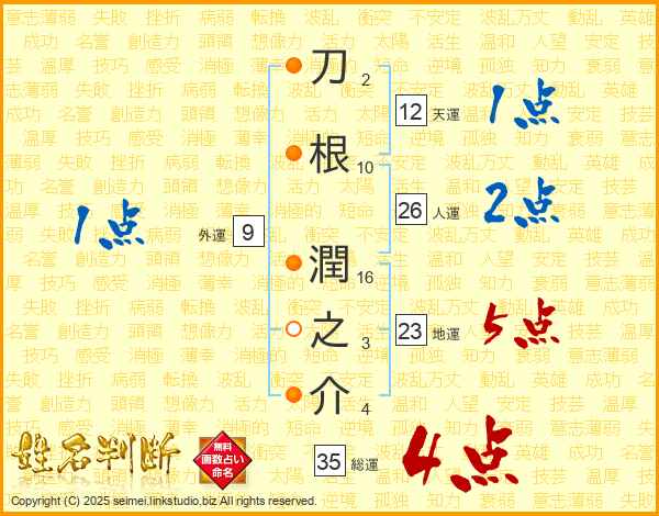 あなたの人生を表す1番重要な運勢です。生涯を通じて影響する総合運となり、主に50歳以降の晩年期に影響を及ぼします。苗字と名前の合計画数。