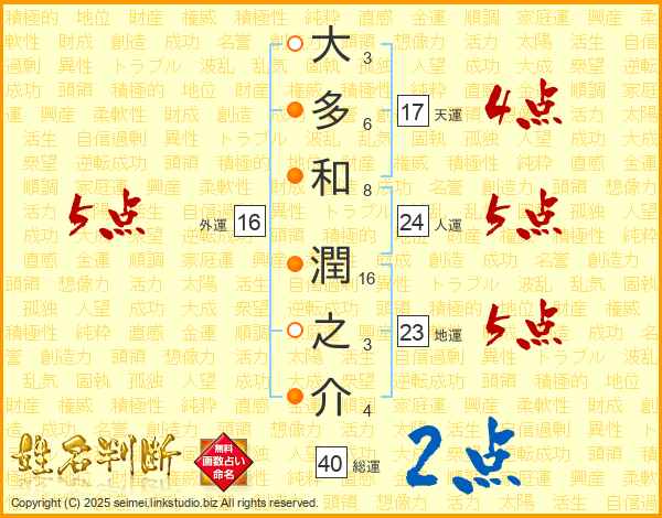 生活面を象徴する運勢です。外部から受ける影響力を表し、結婚運、家庭運や職場、環境への順応性を表します。総運から人運を引いた画数。姓や名が1文字の場合を除く。