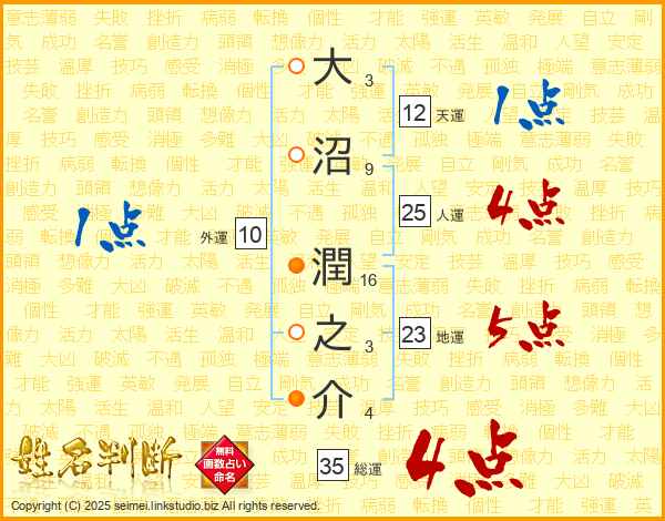 大(3画)沼(9画) 潤(16画)之(3画)介(4画)