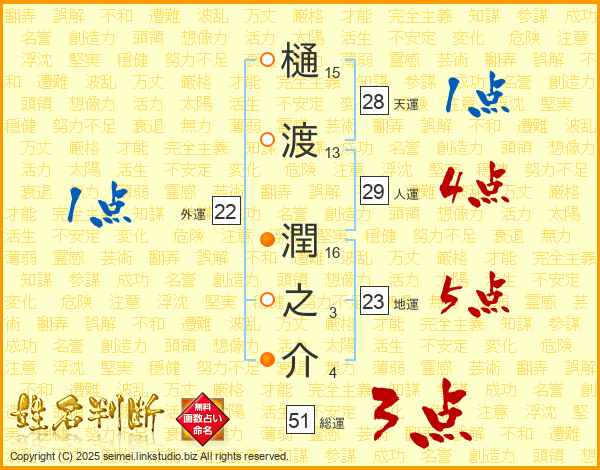 樋(15画)渡(13画) 潤(16画)之(3画)介(4画)