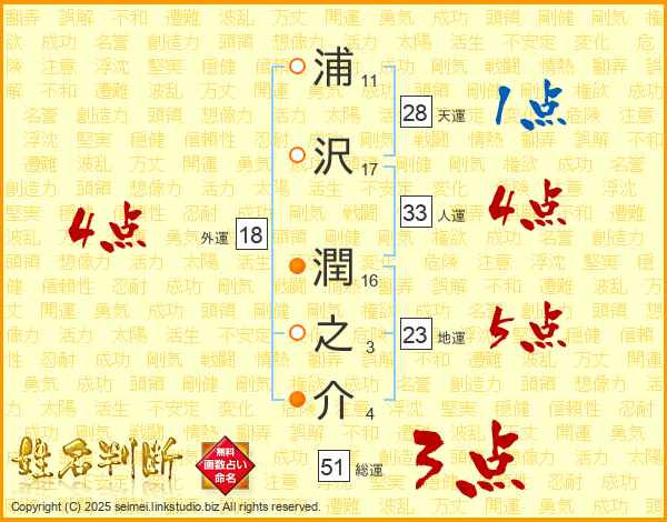 浦(11画)沢(17画) 潤(16画)之(3画)介(4画)